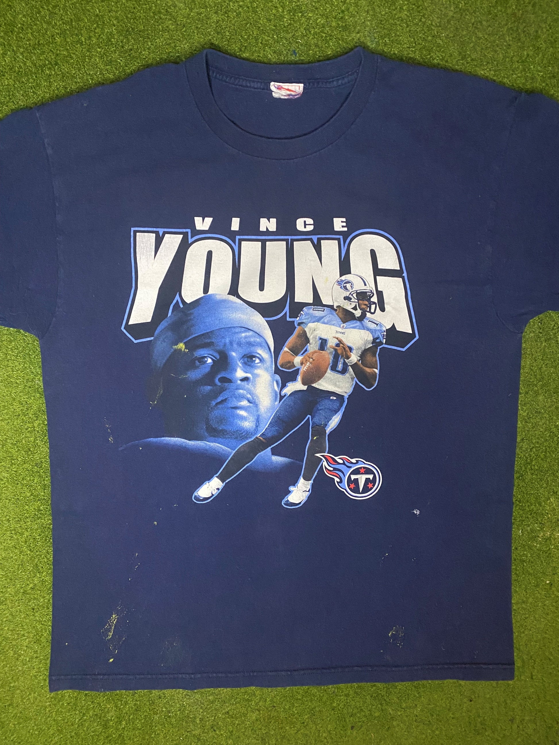 Don't miss out on owning a piece of memorabilia that embodies both style and history. Grab your "00s Tennessee Titans - Vince Young - Vintage NFL Player T-Shirt" today, and wear it with pride as you celebrate the legacy of one of the Titans' finest!