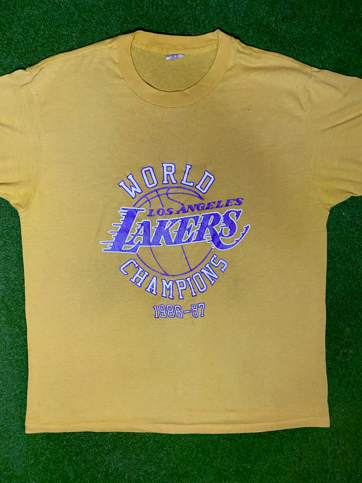 Introducing the 1987 Los Angeles Lakers - World Champions - Vintage NBA T Shirt (XL), a true gem for basketball enthusiasts and vintage collectors alike! This classic tee pays homage to one of the most iconic teams in NBA history, celebrating the triumphant 1987 Lakers, a team that dominated the court and captivated fans with their legendary gameplay.