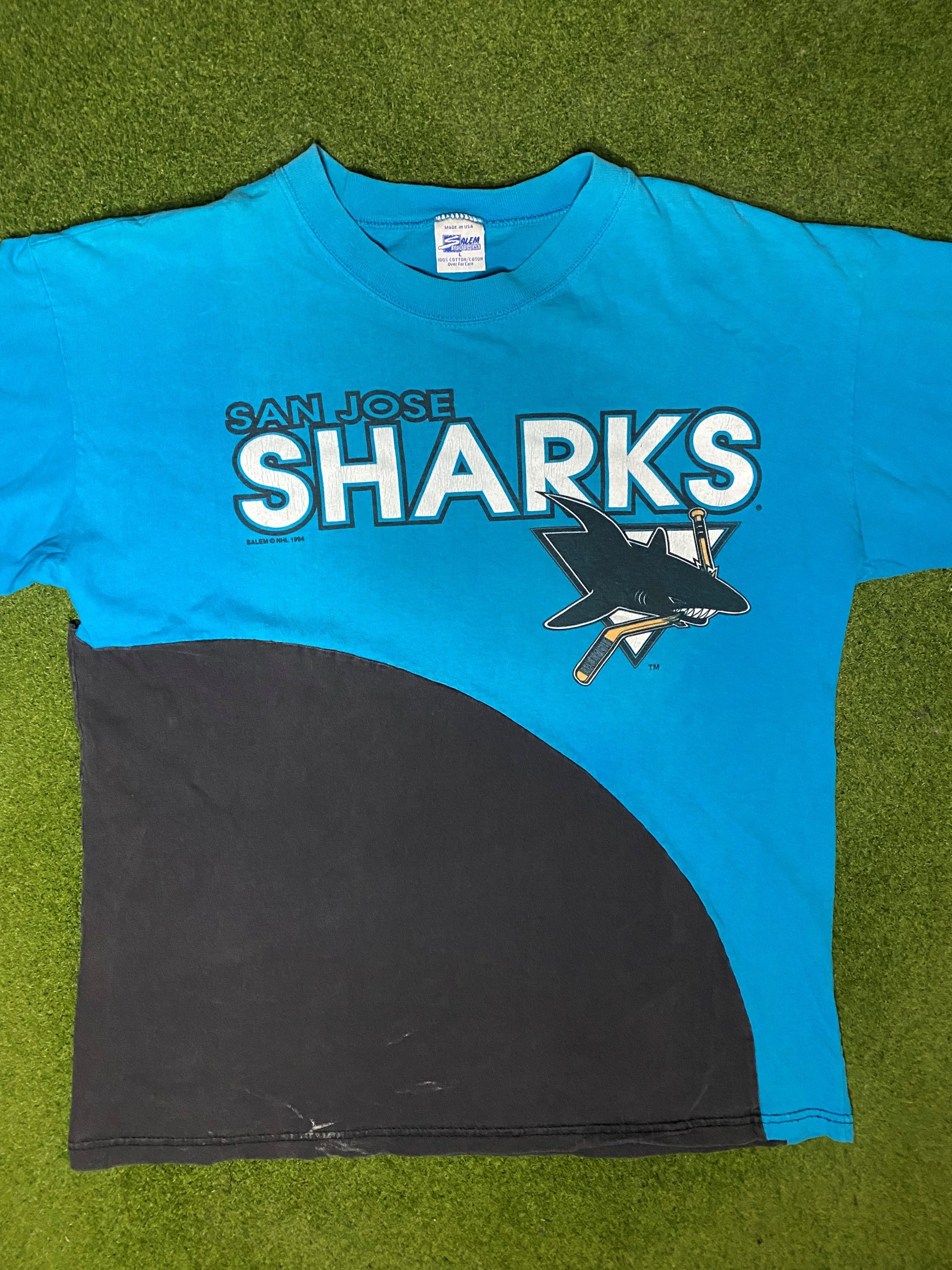 Introducing the 1994 San Jose Sharks - Vintage NHL Tee in size Large, a timeless piece that celebrates the early days of one of the NHL's most exciting franchises. This officially licensed vintage tee is not just a shirt; it's a nostalgic tribute to the iconic 1994 season when the Sharks made their unforgettable debut in the league, captivating the hearts of hockey fans everywhere.