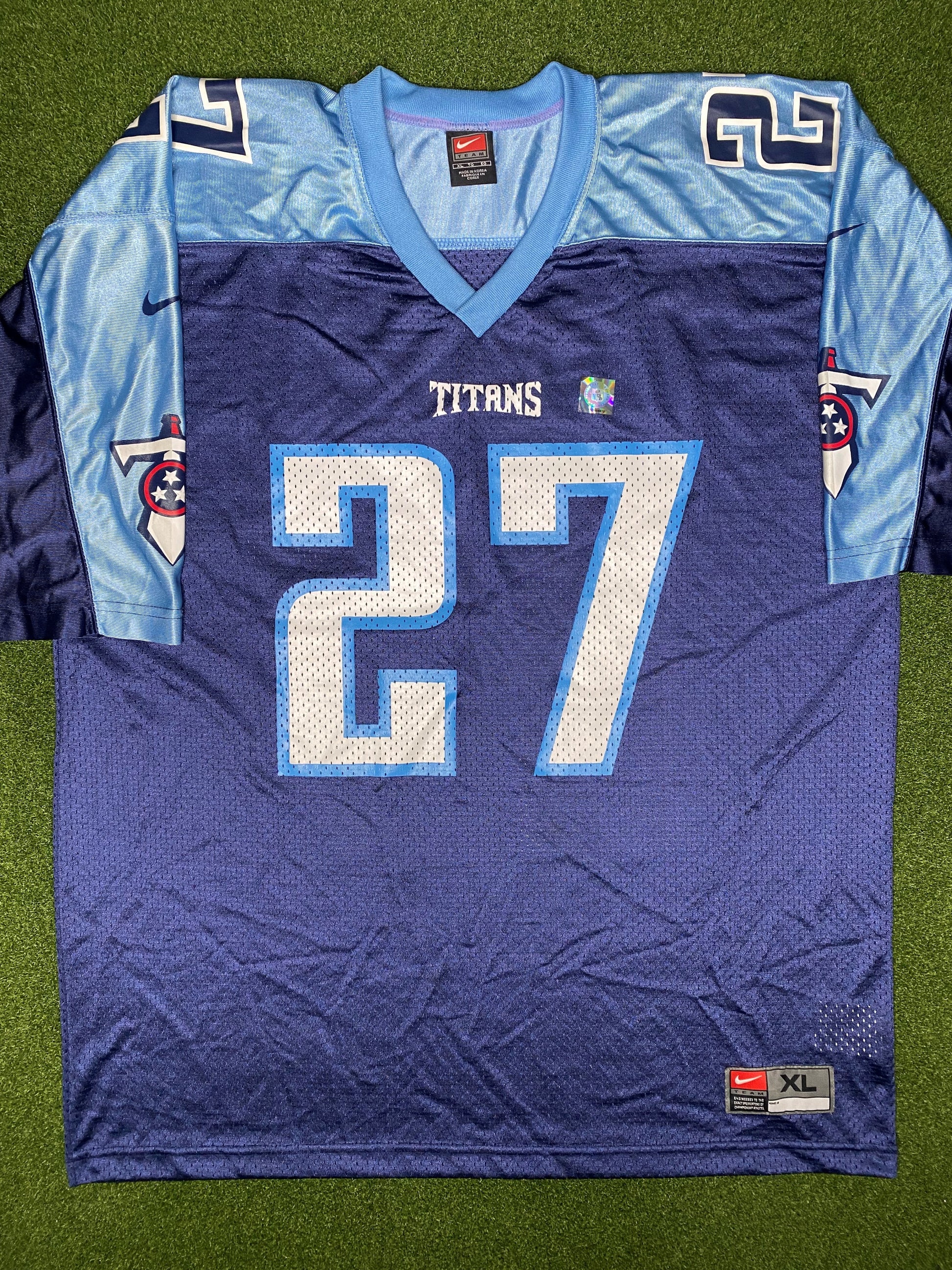 Whether you're a lifelong Titans fan, a lover of vintage sports gear, or simply looking to pay tribute to one of the greats, the 1997-2001 Tennessee Titans - Eddie George #27 - Champion - Vintage NFL Jersey in XL is a quintessential addition to your wardrobe. Grab yours today and take a step back into the electrifying era of football when legends were made and memories were created!