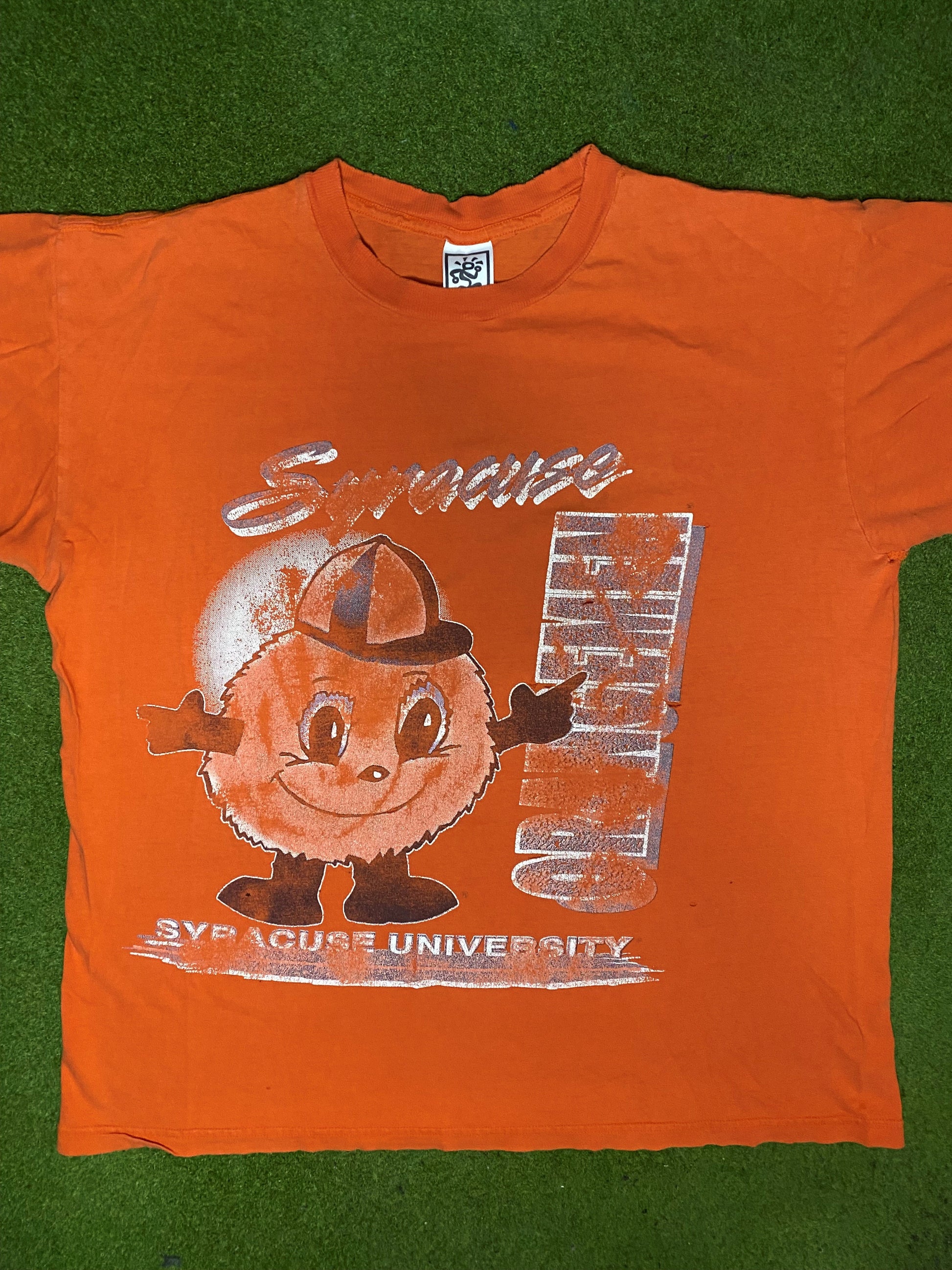 With its vibrant orange and blue color scheme, the shirt prominently features the legendary Syracuse Orangemen logo, allowing you to showcase your team pride in style. The vintage design gives it a classic, weathered look, reminiscent of your college days or perhaps even the 90s era itself, making it a perfect addition to your wardrobe if you appreciate retro apparel.