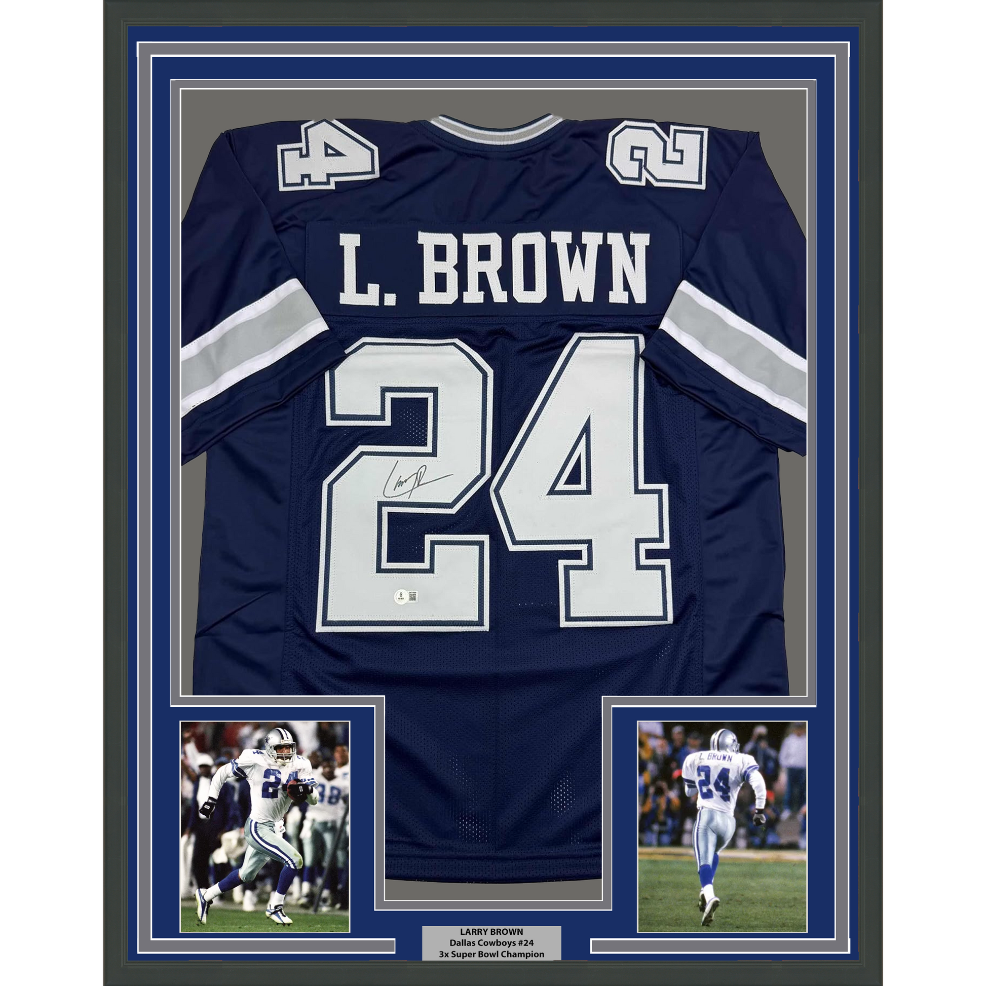 Framed Autographed/Signed Larry Brown 35x39 Dallas Blue Football Jersey Beckett BAS COA