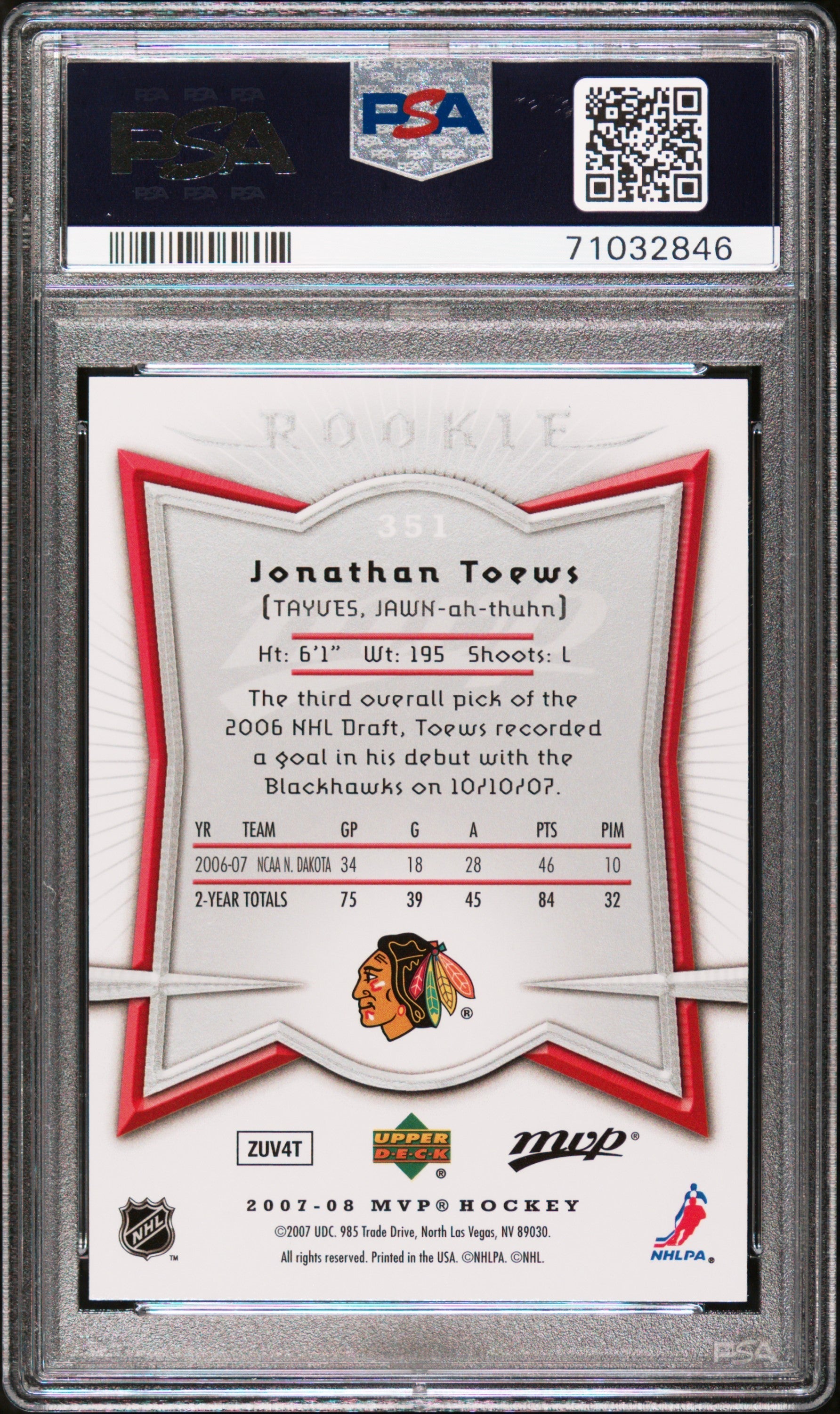 Graded 2007 Upper Deck MVP Jonathan Toews #351 Rookie RC Hockey Card PSA 10 Gem Mint