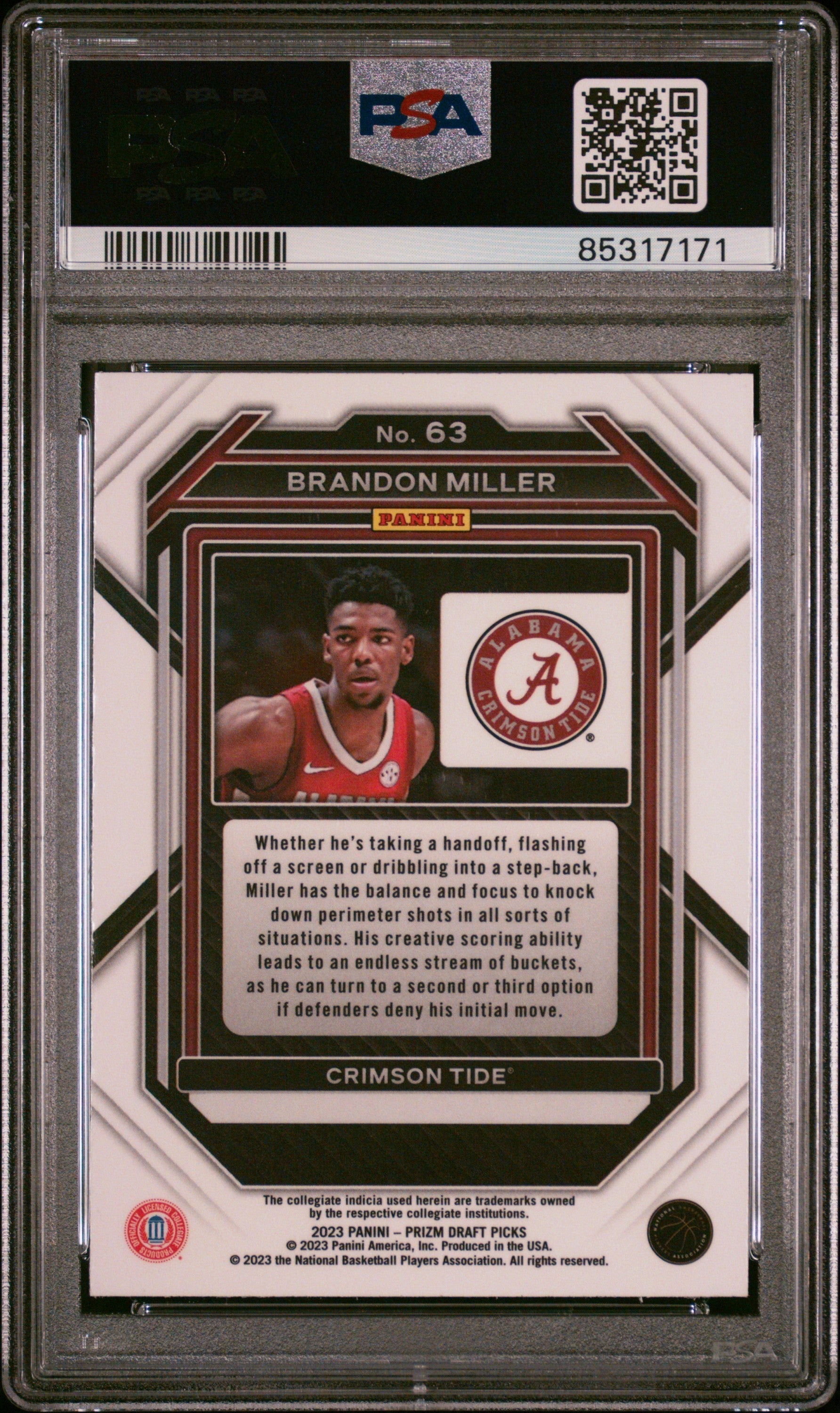 Graded 2023 Panini Prizm Draft Picks Brandon Miller #63 Rookie RC Basketball Card PSA 10 Gem Mint