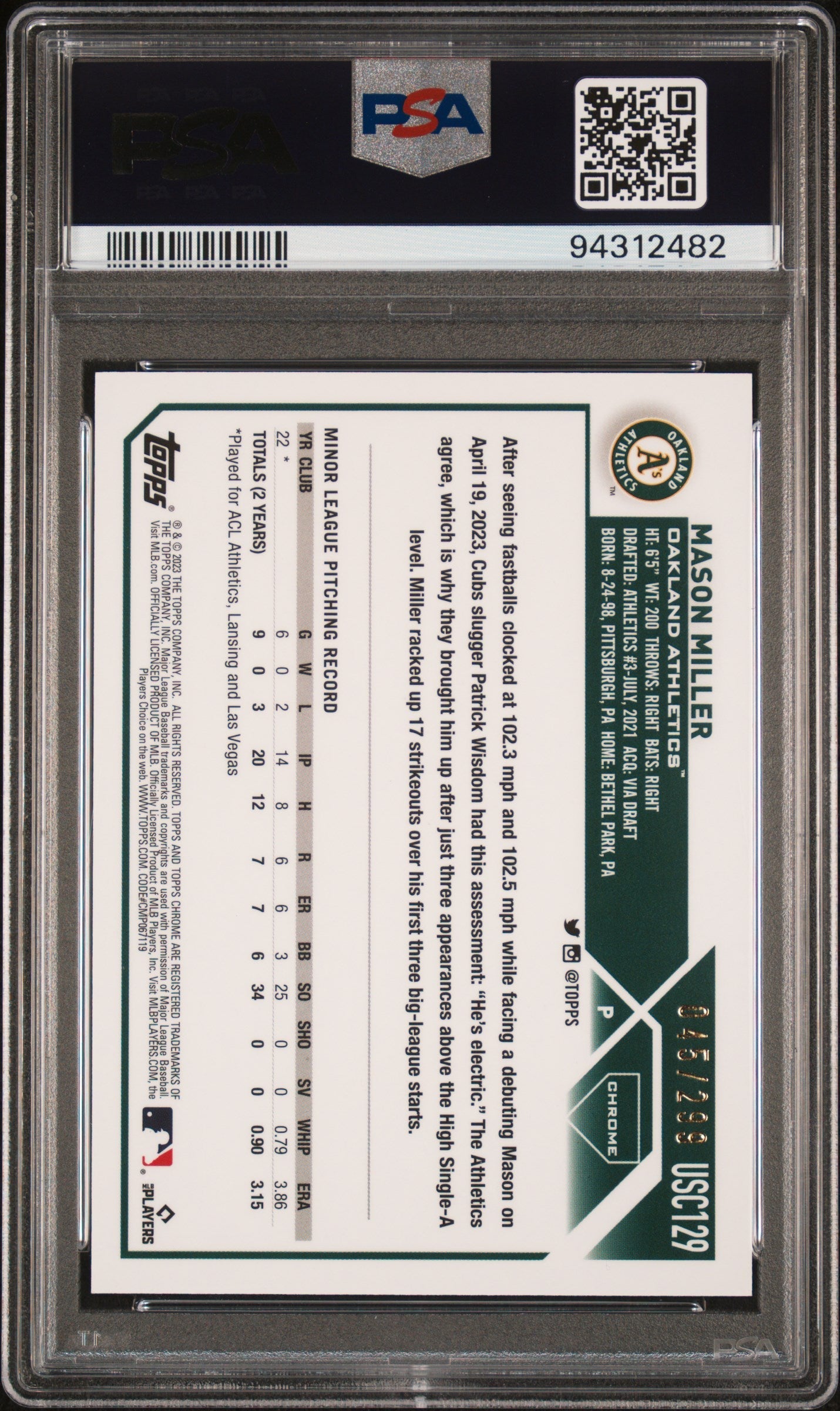 Graded 2023 Topps Chrome Update Mason Miller #USC129 Magenta/Purple Lava Lamp Refractor #/199 Rookie RC Baseball Card PSA 10 Gem Mint