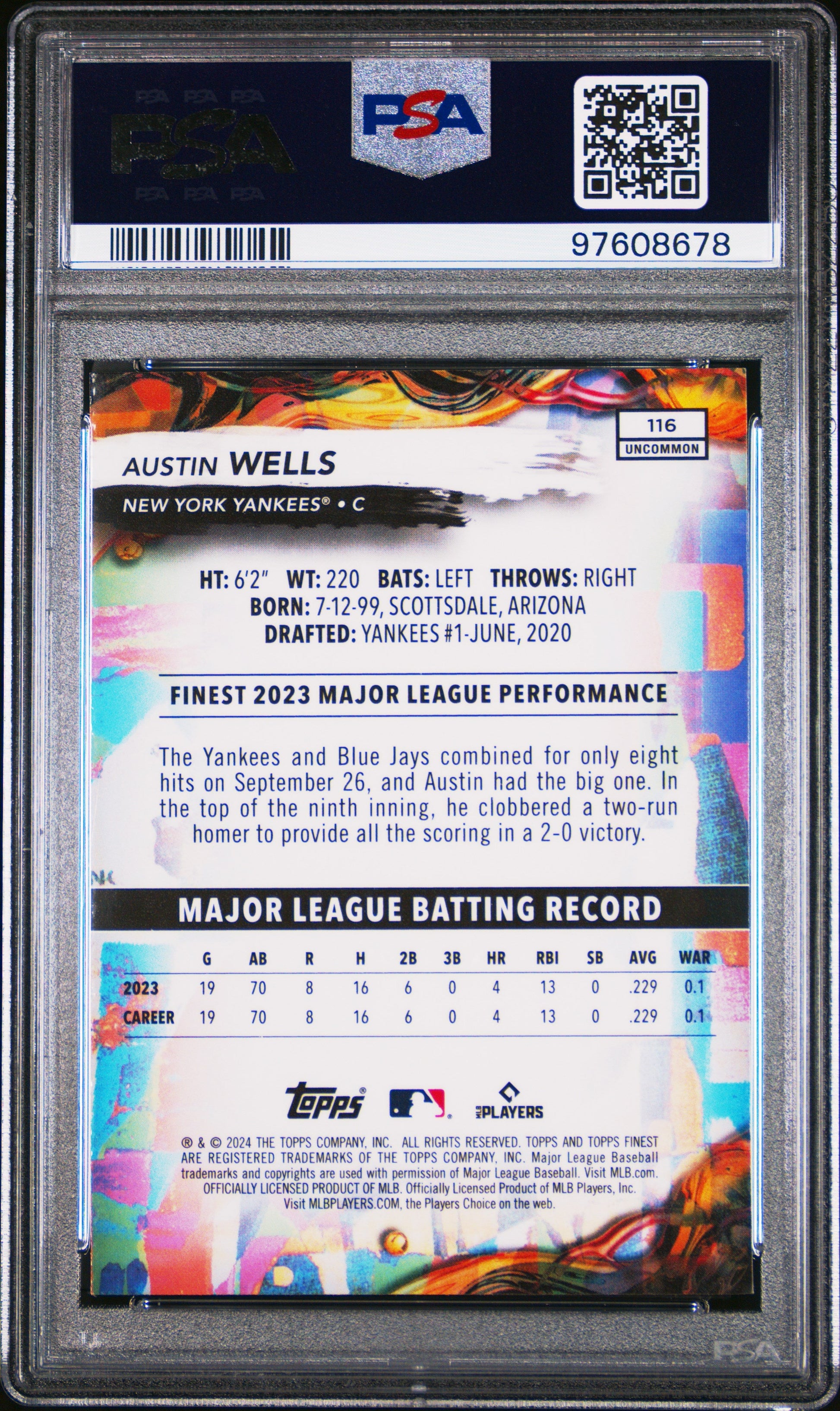 Graded 2024 Topps Finest Austin Wells #116 Checkerboard Refractor Rookie RC Baseball Card PSA 10 Gem Mint