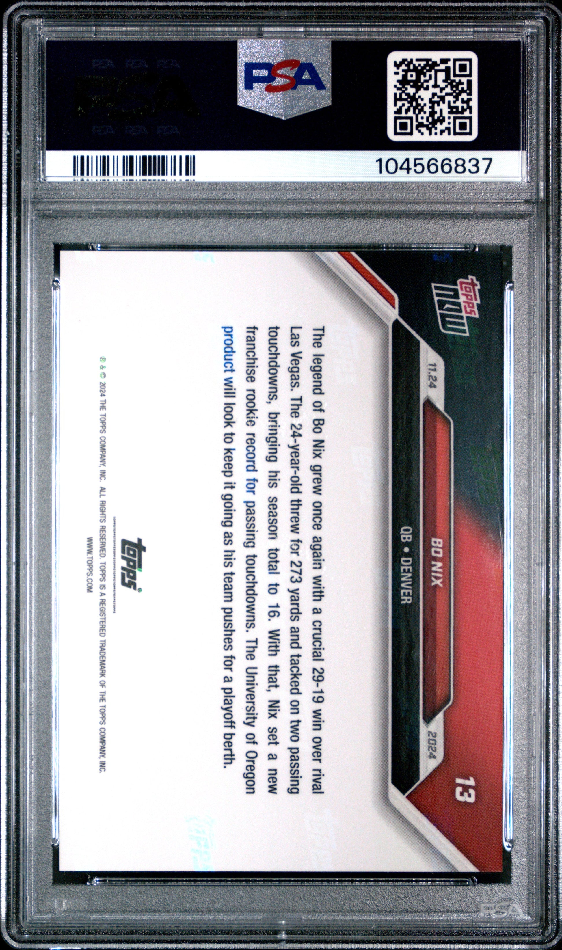 Graded 2024 Topps Now Bo Nix #13 Rookie RC Football Card PSA 10 Gem Mint