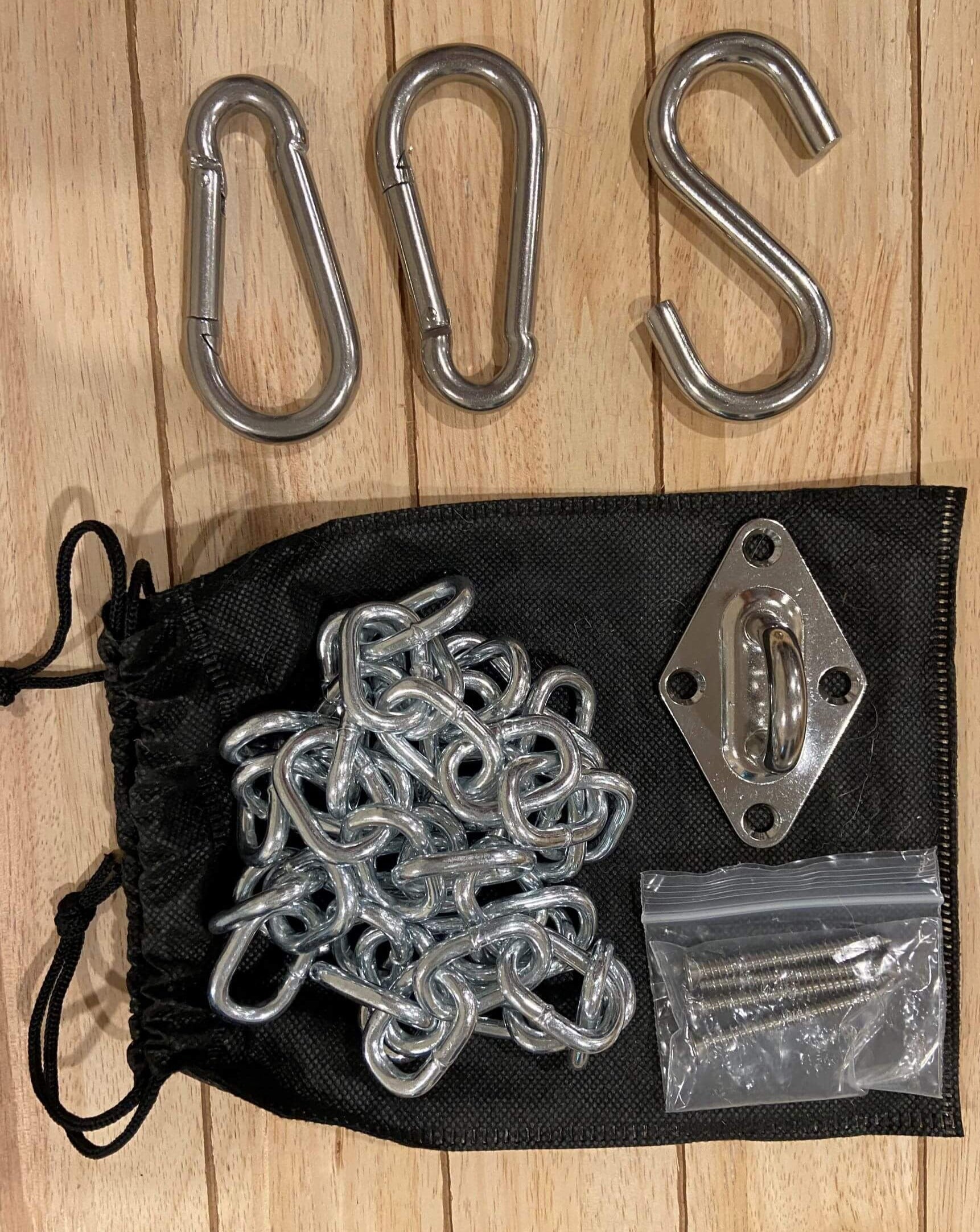 This suspension kit includes every piece of hardware you need to set up your hanging hammock chair indoors securely. It is made of premium stainless steel to protect against corrosion and rust. Easy to install and you can rest assured that it will support up to 300 lbs when properly set up.